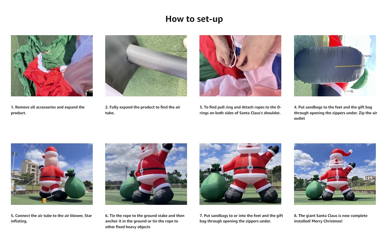 šćEasy to useć: Fill the sandbag with heavy objects and put them into Santa's feet first, and then tie the rope to the strong metal D ring on Santa's body. Equipped with a high-power blower, just plug in, the inflatable decoration will self-inflate in a few minutes and you can see the full inflatable, Santa Claus. After inflation, please fix it with floor nails and you can get an attractive Christmas inflatable.