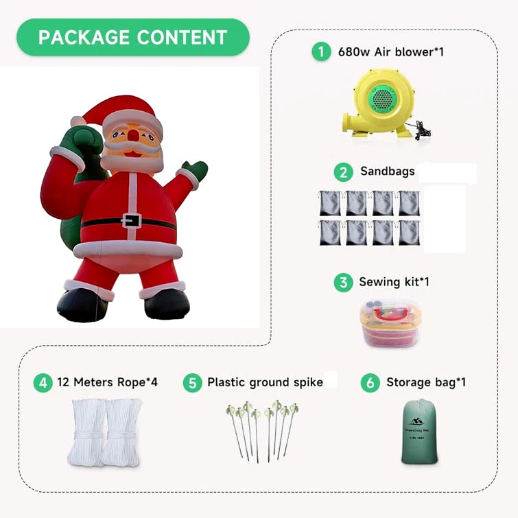 - š ćPackage Includedć: 1x 26ft inflatable Santa, 1x 680W blower, 1x Carrying bag, 4x Ropes, 8x sandbags, nails and repair kits.