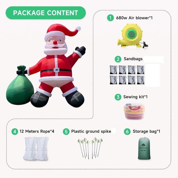 - š ćPackage Includedć: 1x 26ft inflatable Santa, 1x 680W blower, 1x Carrying bag, 4x Ropes, 8x sandbags, nails and repair kits.